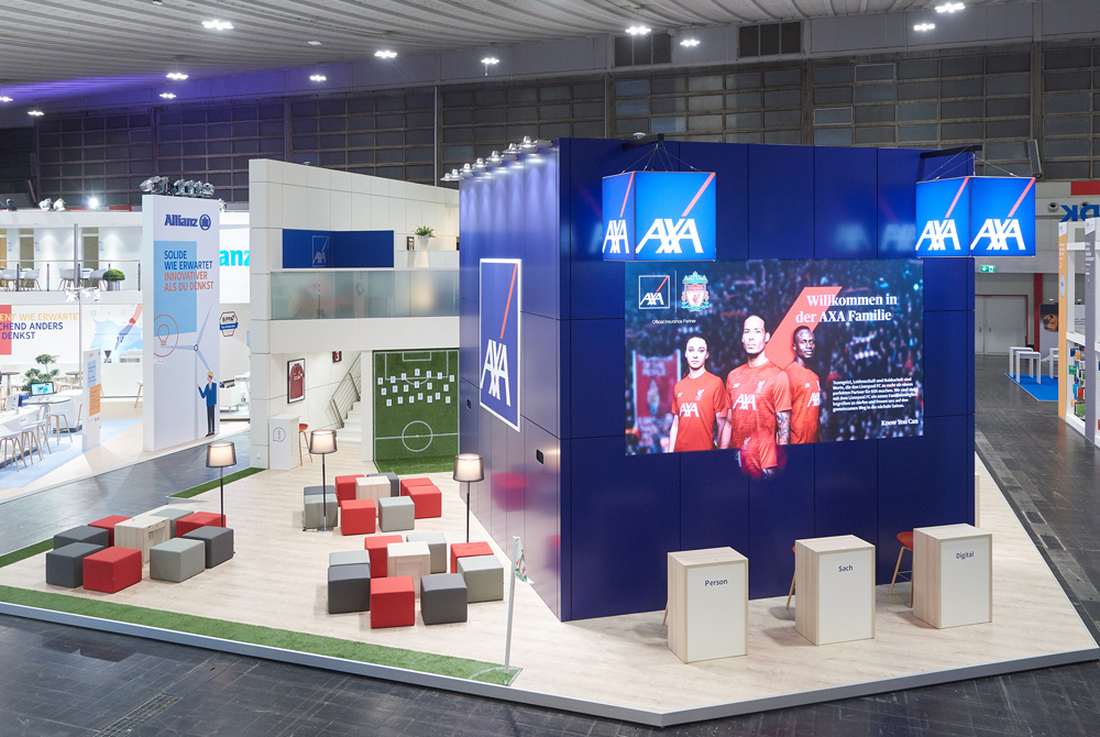 Das aktuelle „Willkommen in der AXA-Familie“ zielte diesmal speziell auch auf junge Leute ab. Cocooning, das Gefühl für Gemeinschaft und das Zuhausesein, fand unter anderem Umsetzung in einer stilisierten WG-Küche. Auch das Sponsoring der AXA für den Liverpool FC zitierten wir auf beiden Standgeschossen medial (LED-Wand) und materiell (Rasenfläche, Fanshop) ausgiebig stimmig und mit Freude an Farben.