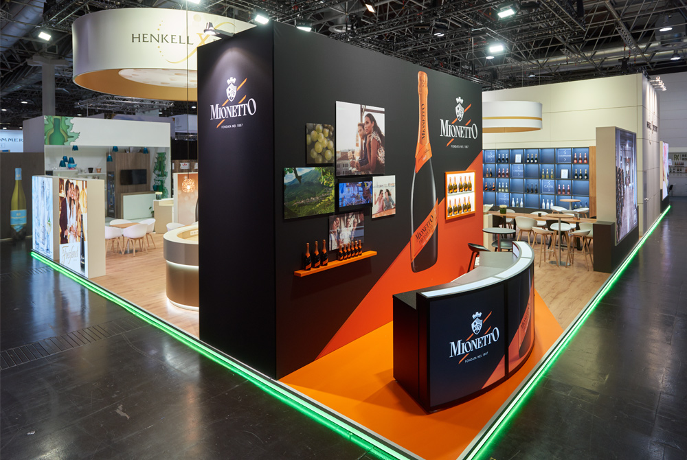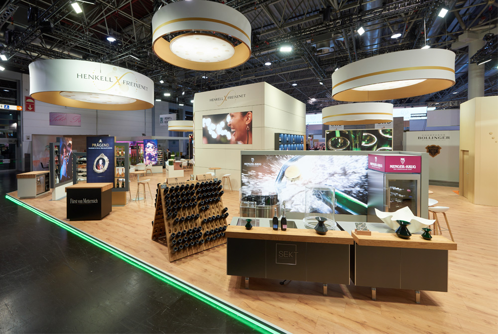 Am Ende eines wirklich langwierigen und intensiven gemeinsamen Modellierungsprozesses führte schließlich ein informationsstarker „Touchpoint“-Erlebnisweg die Besucher durch die prickelnde Welt von Cava, Sekt, Prosecco und Champagner. Da der Aussteller Sektherstellung ausdrücklich als kunstvolles „Handwerk“ versteht und betreibt, setzten wir den handwerklichen Bezug in der Materialität der Ausstattung mit viel Massivholz, traditionellen Holzverbindungen und individuell gestalteten Thekenkonstruktionen konsequent und durchgängig fort.