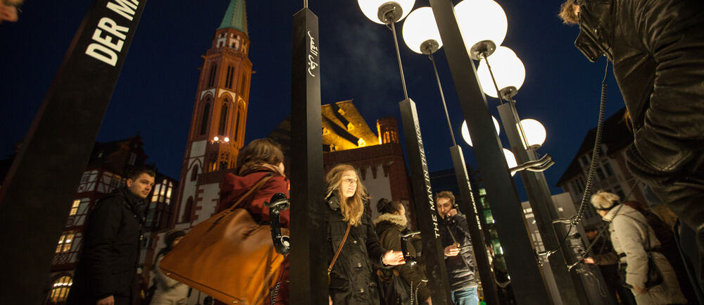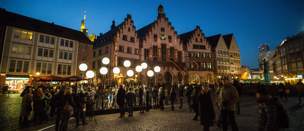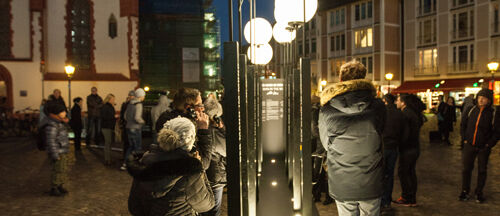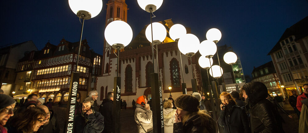 Die Frankfurter Agentur für Markenerlebnisse VOSS+FISCHER widmete ihren kreativen Beitrag dem sehr realen und bedrückenden Thema Kinder in Krieg und Not. Isinger + Merz war bei der Umsetzung der Lichtinsel „Der Mann im Mond“ konstruktiver Partner im Rahmen eines Fachteams und Garant für einen bleibenden Eindruck bei den Passanten auf dem Römerberg.