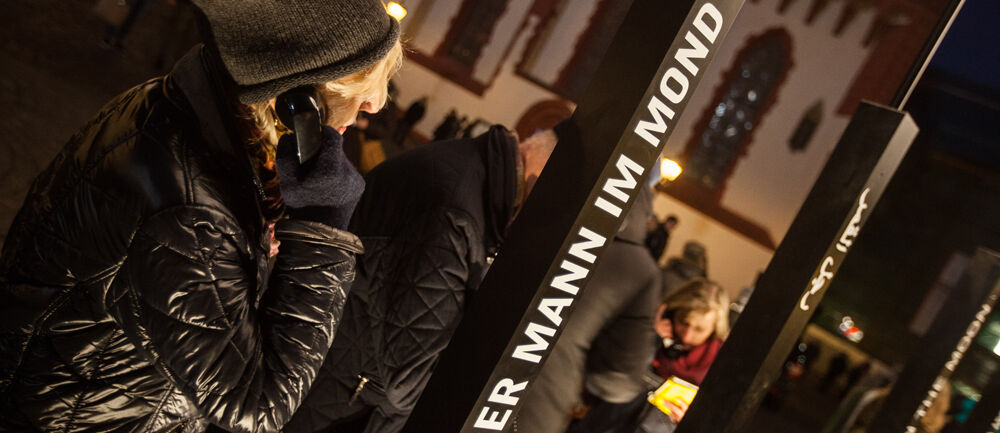Über Telefonhörer an insgesamt elf Säulen erzählte der „Mann im Mond“ auf Deutsch, Englisch und Arabisch vom Verlust des beschützenden nächtlichen Mondlichts für die Kinder in einer krisengeschüttelten Welt. Untermalende Wiegenlieder aus Syrien und Iran wurden immer wieder von Kriegslärm gewaltsam unterbrochen. Gerade die Beschränkung auf die minimale Telefonakustik und der Verzicht auf großflächige optische Untermalung verstärkten das Ernüchternde der fahlen Szenerie.