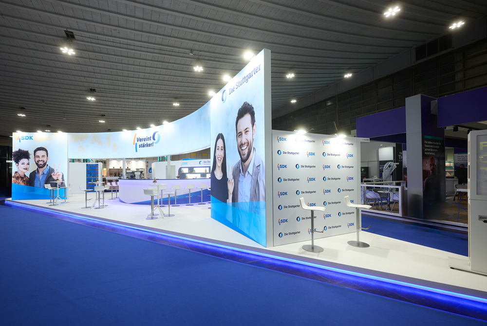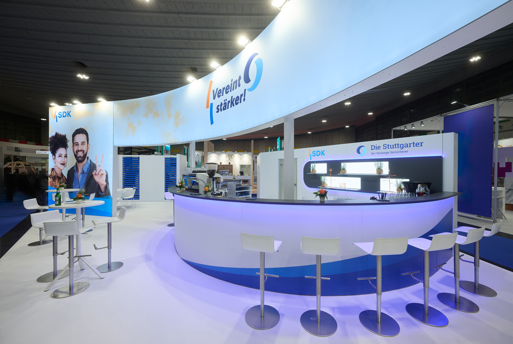 Mit einem modernen, allseitig begehbaren offenen Standkonzept hat unser Team auf der diesjährigen DKM in Dortmund einen eindrucksvollen Markenauftritt für die Stuttgarter Versicherung und die SDK realisiert. Beide Unternehmen präsentierten sich klar erkennbar in ihren Markenidentitäten – und zugleich als starkes, visuell verbundenes Duo.